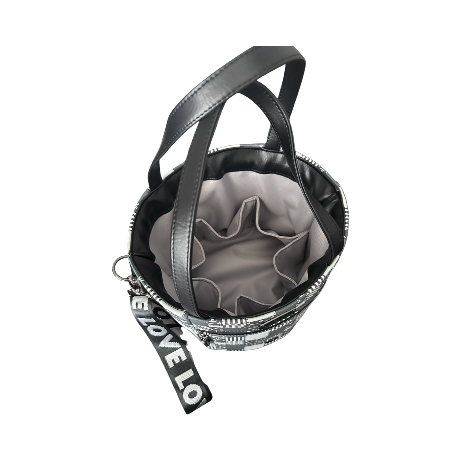 This bag is made from cotton fabric, vinyl, and waterproof canvas for the lining