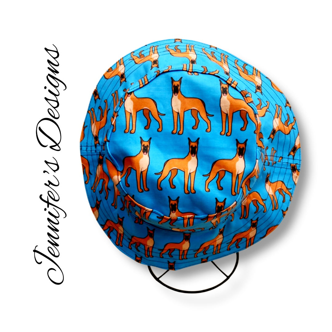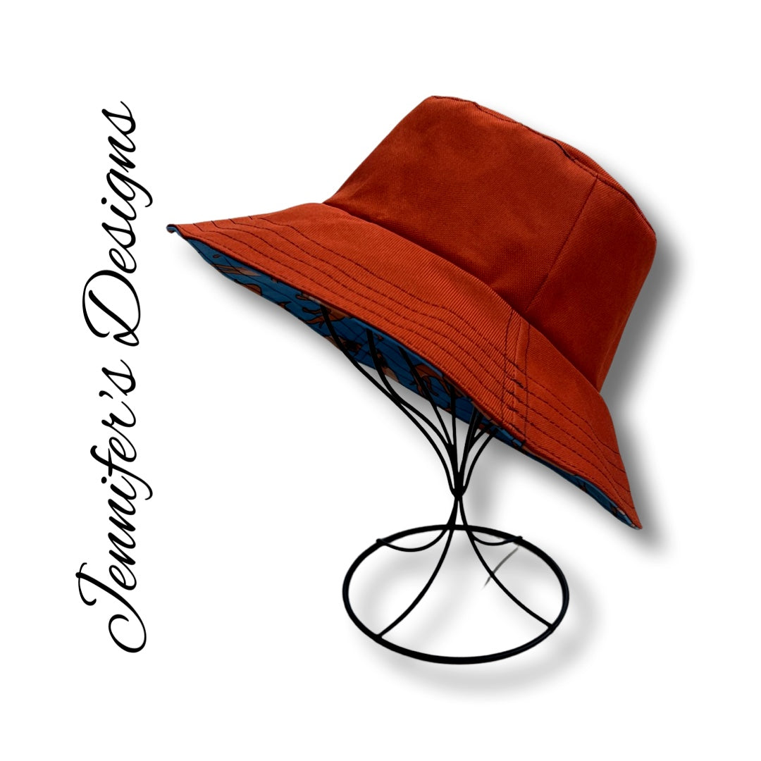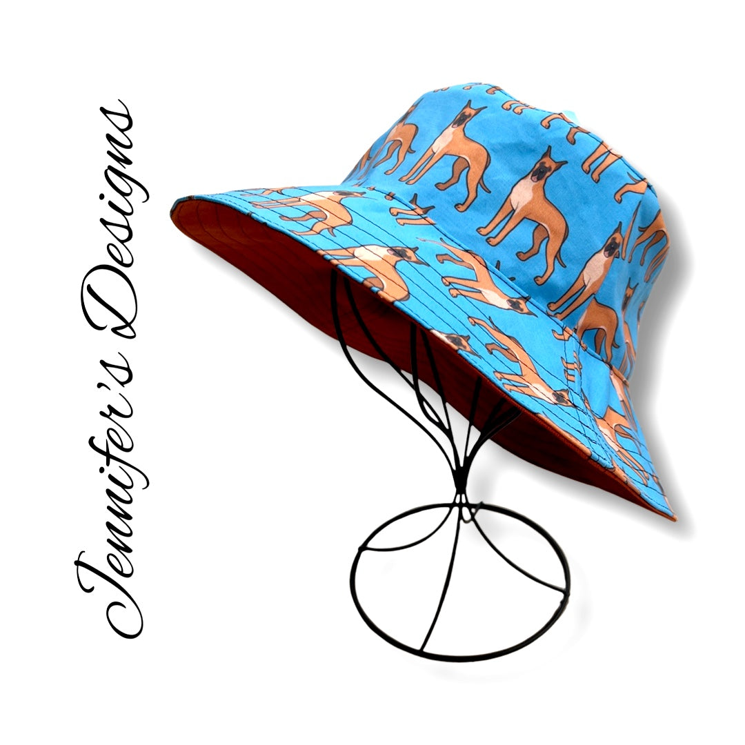 This hat is made from faux vinyl, cotton fabric, and waterproof canvas.